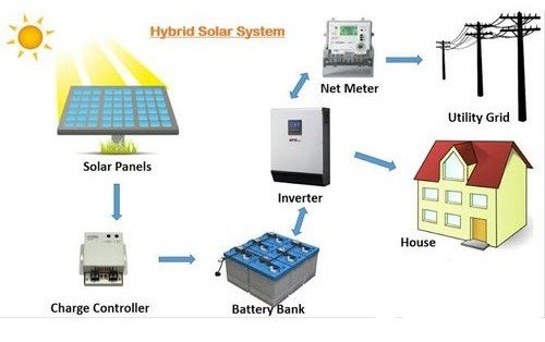 The system includes high-efficiency solar panels, a hybrid inverter, battery bank, and smart control systems for energy management.